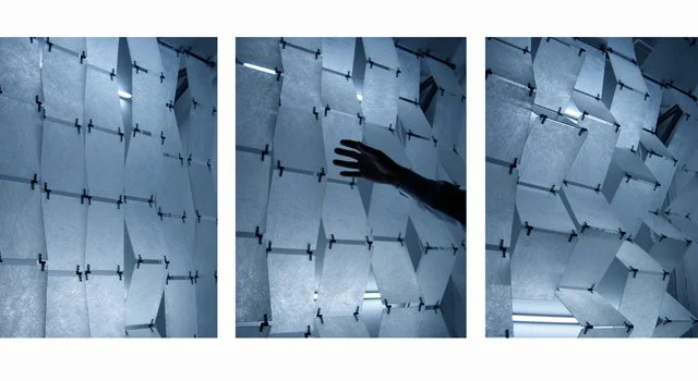 Awarded the Future Furniture Award by Interior Design Magazine, the Adjustable Screen is a flexible architectural system designed to filter light, divide interior spaces, or serve as an illuminated backdrop. Vertical rows of translucent fiberglass panels are connected by high-torque friction hinges, allowing manual adjustment into accordion-like forms. Its kinetic, sculptural configuration creates dynamic zigzag geometries and redefines spatial boundaries and indoor–outdoor permeability.