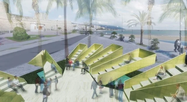 Antonio Pio Saracino received the King Manfredi Award for Architectural Excellence and was commissioned to design King Manfredi Square in Manfredonia, Italy. Inspired by the eagle in the Manfredi family crest, the plaza features elevated ramps forming an open-air theater with seating, reflective pools, and views toward the historic thirteenth-century castle, using titanium panels and local marble.