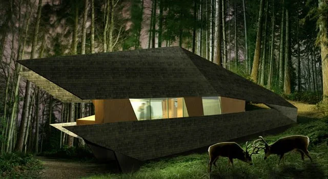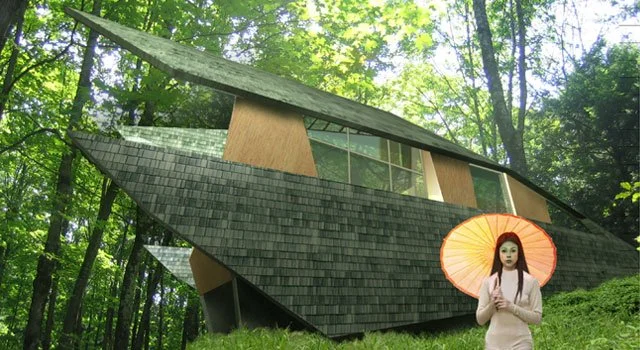 The Seed House, recipient of a 2007 American Architecture Award, is a conceptual 1,400-square-foot country residence designed for an art collector in upstate New York. Inspired by a seedpod, the house features an organic form integrated with the surrounding landscape. Its cedar-clad shell opens through roof and wall slits to reveal a vibrant interior, fostering a dialogue between architecture and nature while blending seamlessly into the wooded environment.