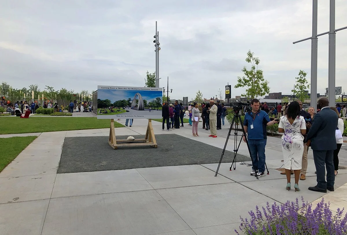 The New Arc by Antonio Pio Saracino, selected through a public competition by Newark EDC and the City of Newark, is a landmark for Mulberry Commons. Inspired by the arch tradition, the work symbolizes cultural heritage and departure from the familiar, serving as a universal portal representing optimism and a bright future.