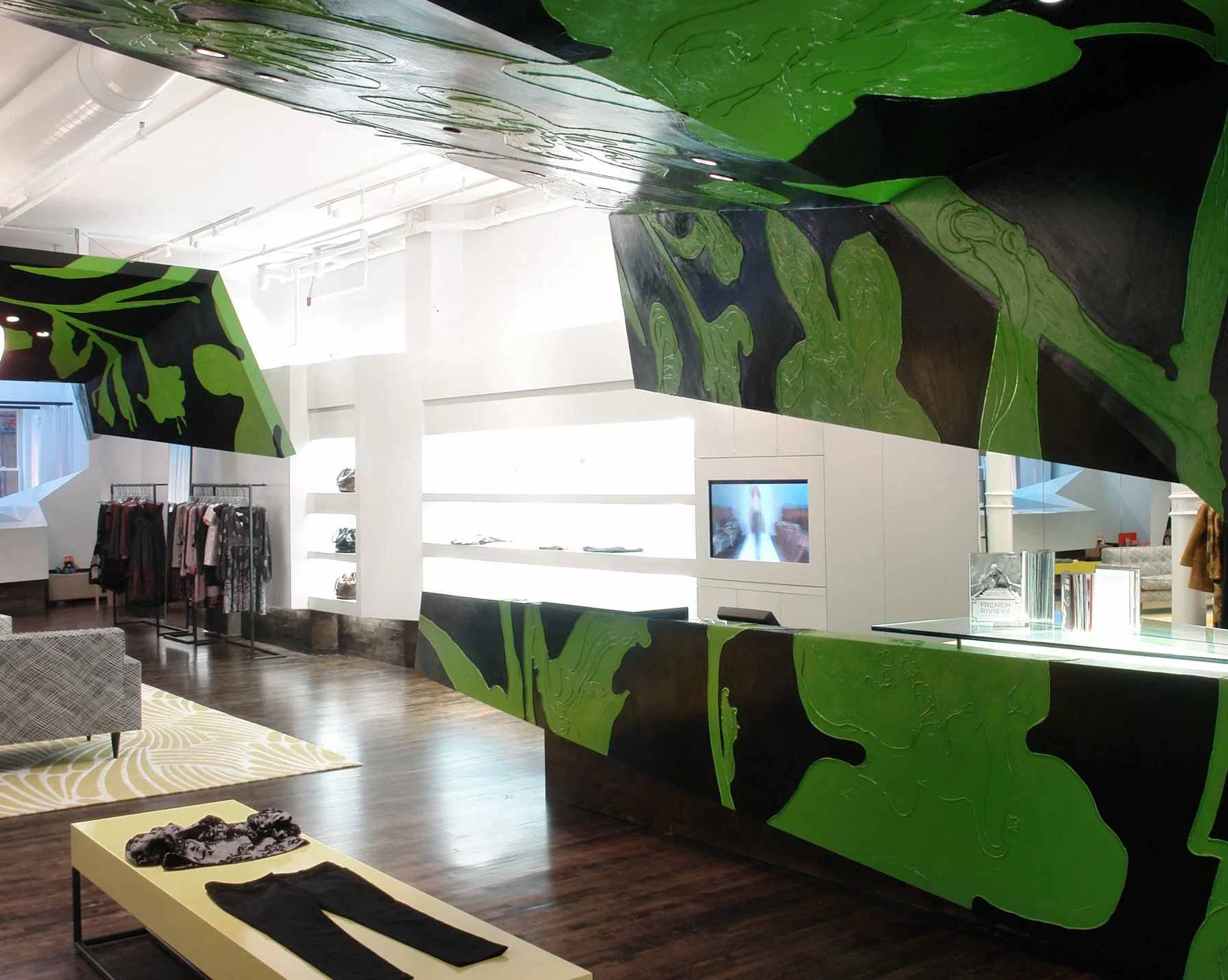 APS Designs’ Tibi SoHo flagship boutique (2200 sq. ft.) fuses fashion, art, and design, bringing the brand’s bold 70’s-inspired prints to life. Sculpted green-and-black canopies guide visitors through dynamic shopping zones, creating an immersive spatial journey. A faceted display wall showcases Tibi’s creations, while the boutique’s lower-level pattern room fosters creativity. The design transforms a classic SoHo space into an elegant, artful retail experience reflecting the brand’s identity.
