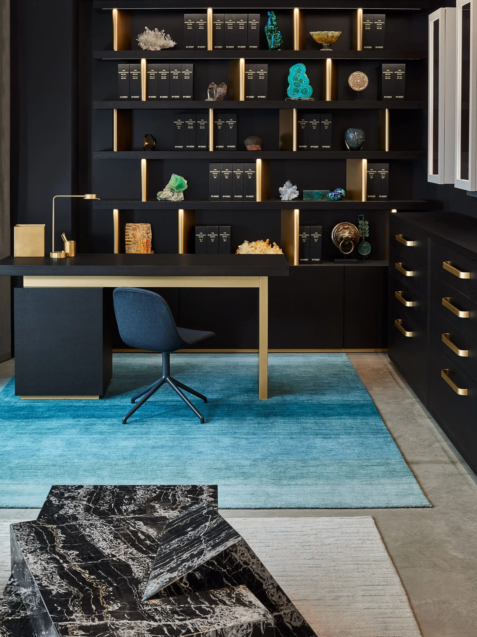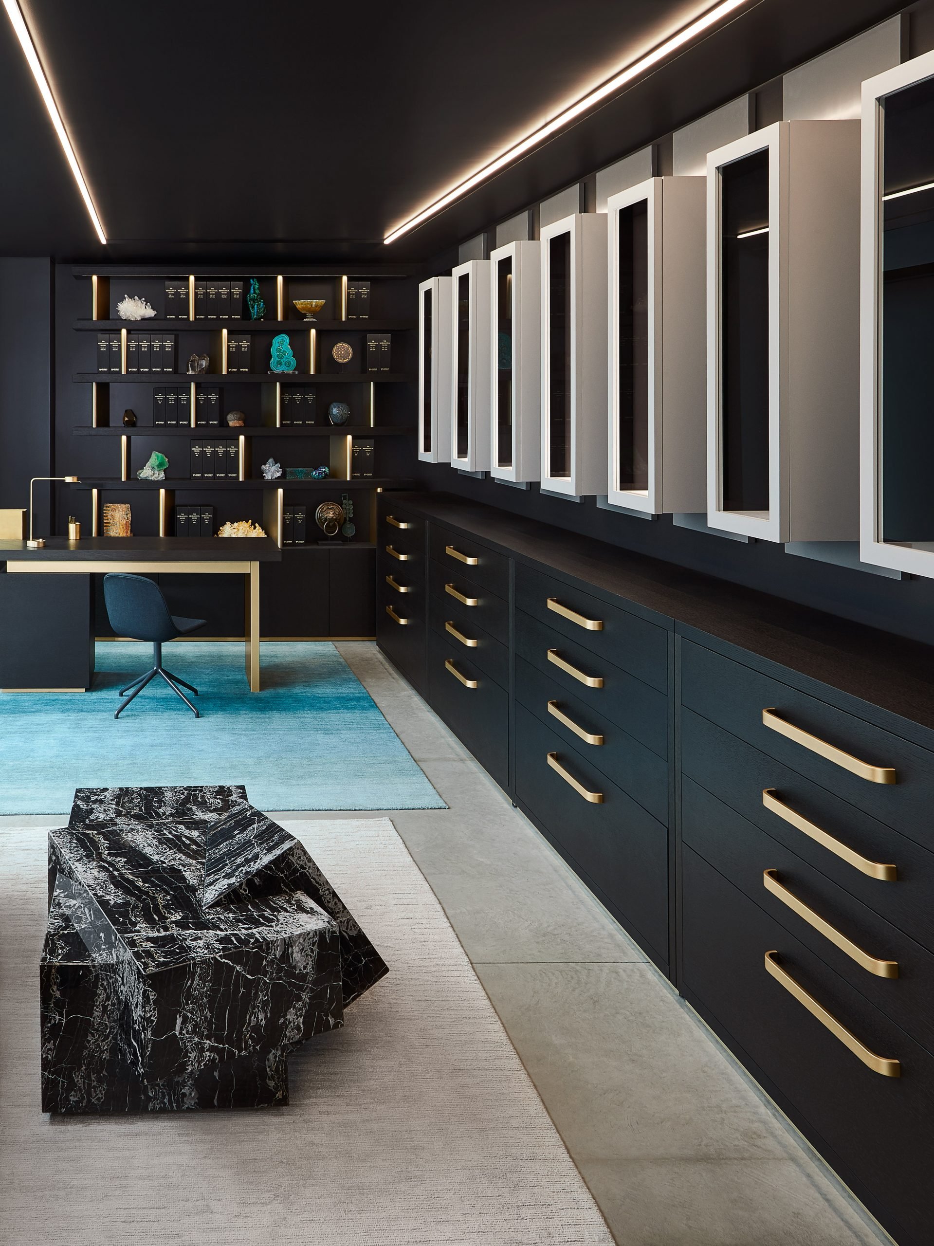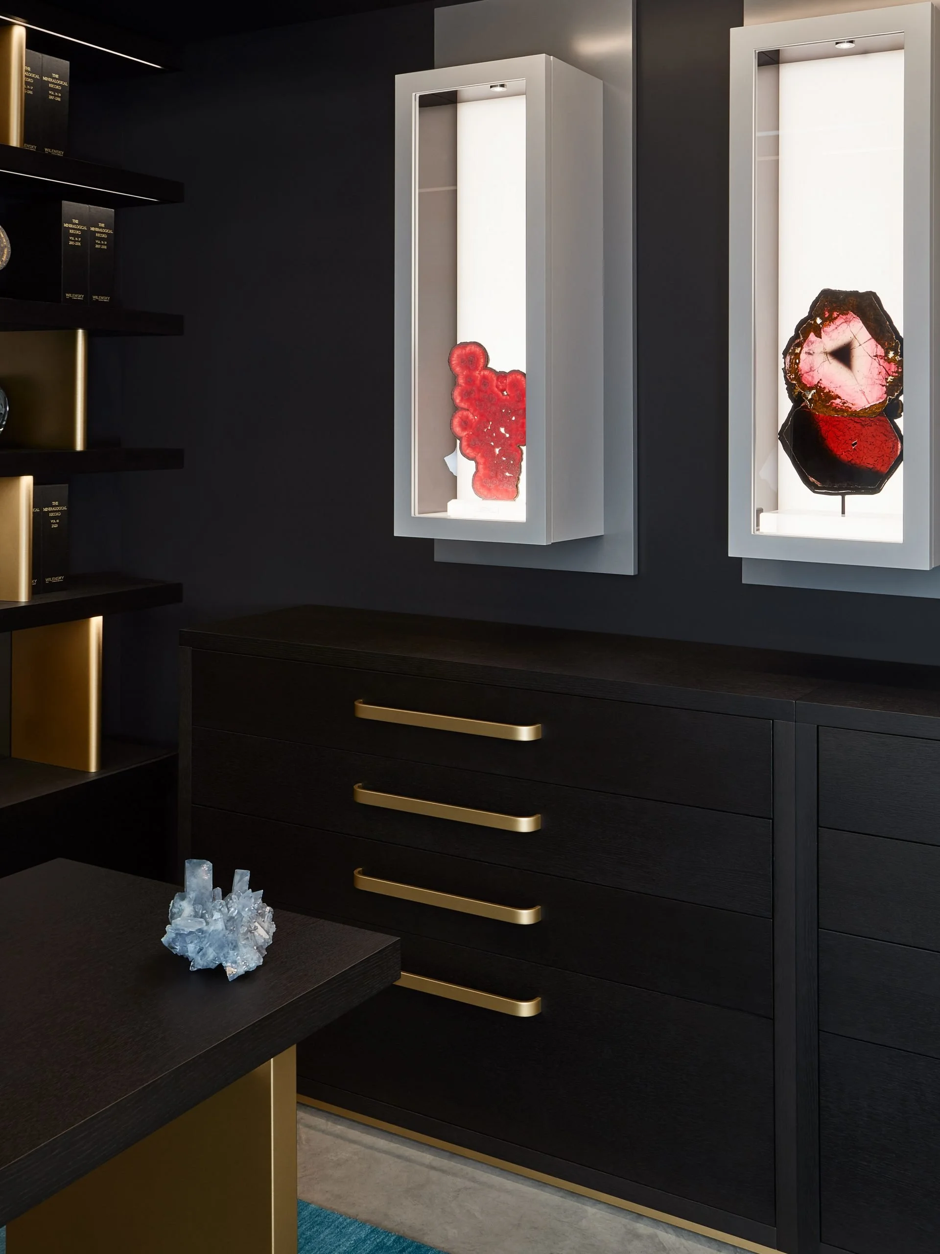The Wilensky Exquisite Mineral Gallery in New York, designed by Antonio Pio Saracino of APS Designs, celebrates the natural beauty and energy of gemstones. Using black walnut, brass, and bespoke Italian marble furnishings, the gallery elevates each mineral’s vibrancy. Dynamic lighting, sculptural displays, and a fusion of scientific and contemporary design create an immersive, meditative environment, allowing visitors to connect intimately with the allure, texture, and brilliance of nature’s treasures.