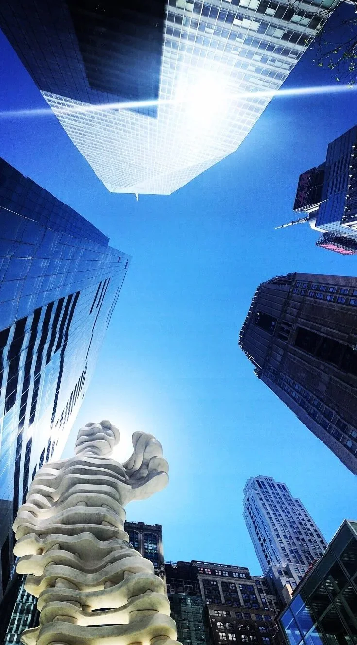 “The Guardians: Hero and Superhero” by Antonio Pio Saracino are two 13-foot public sculptures at Three Bryant Park, New York. Hero, an 8,000-pound marble statue gifted by Italy, reinterprets Michelangelo’s David as a protector of the past, while Superhero, a 15,000-pound stainless steel figure commissioned by Equity Office, represents the present. Both use stacked planar forms echoing surrounding architecture, symbolizing civic resilience and the dialogue between past and present.