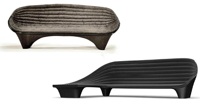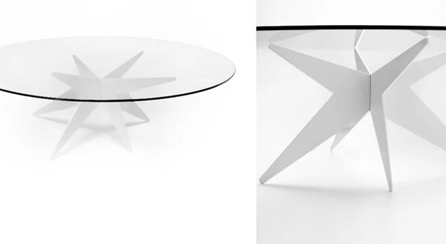 Antonio Pio Saracino showcased new Italian-made designs at Salone del Mobile 2014. The Hexa collection features hexagonal, petal-based seating with leather or fabric cushions on stainless-steel frames. The Flow collection offers curved, fluid sofas and chairs with monolithic shell bases. The Grape low tables are modular with hand-painted ceramic tops. The Star Collection explores star-shaped chairs and tables in aluminum with optional leather, highlighting sculptural, geometric design.