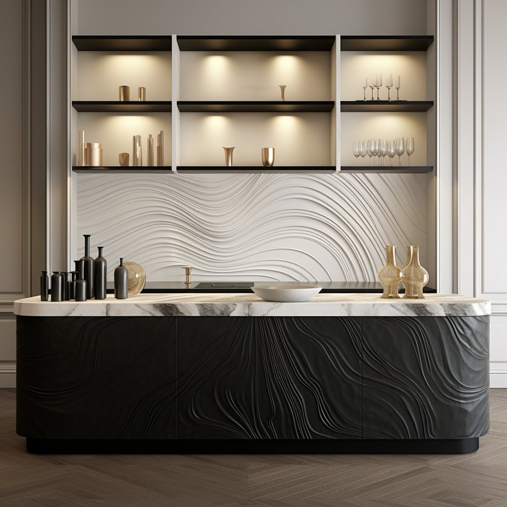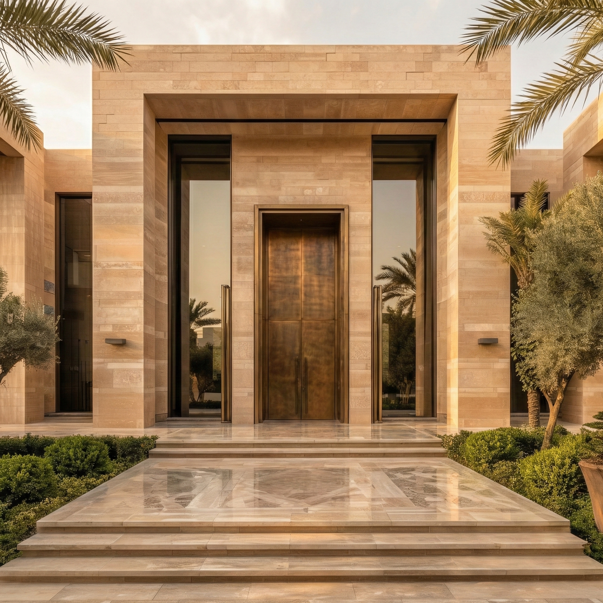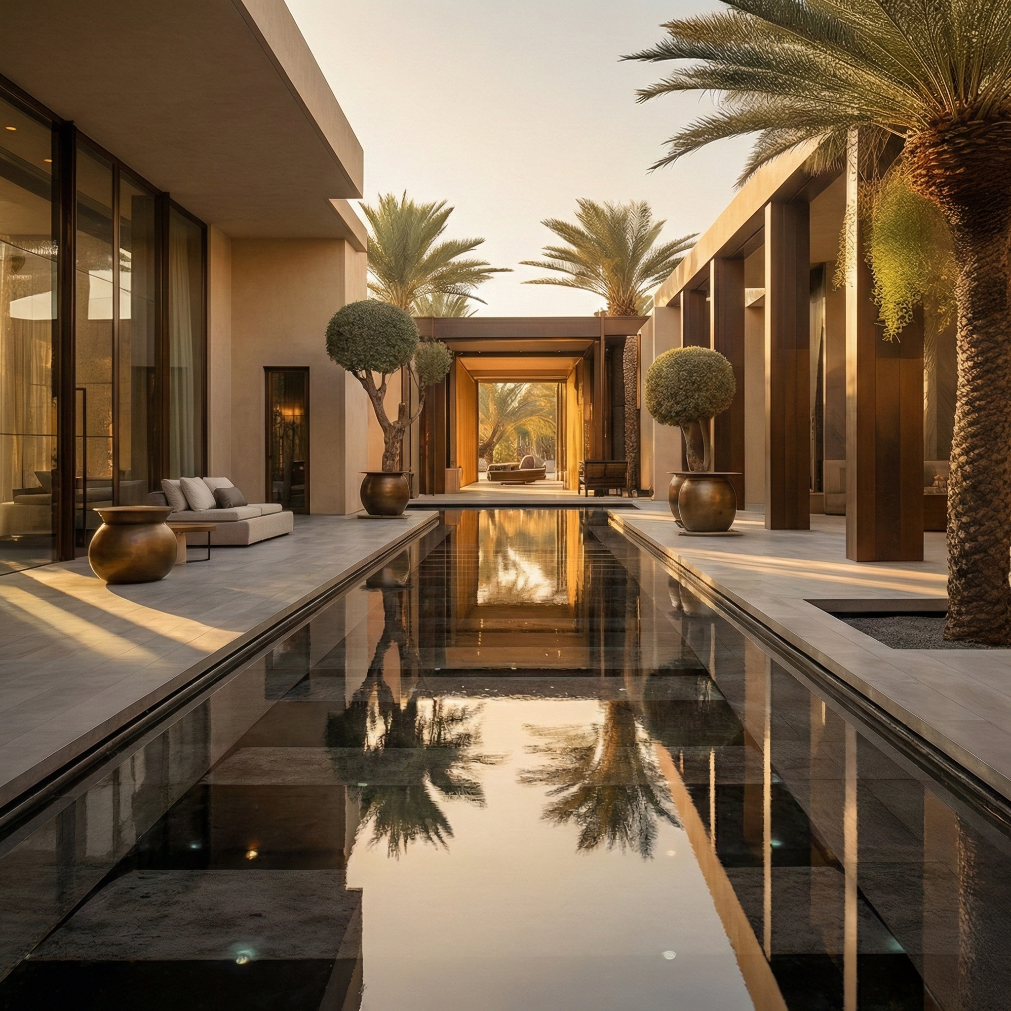 Villa Al Mazrou by APS Designs is a 1,000 sqm (11,000 sf) six-bedroom residence in Sharjah, UAE. Grand portals and sculptural bronze doors open to travertine walls with pocket waterfalls and carefully tuned shading that draws in natural light.