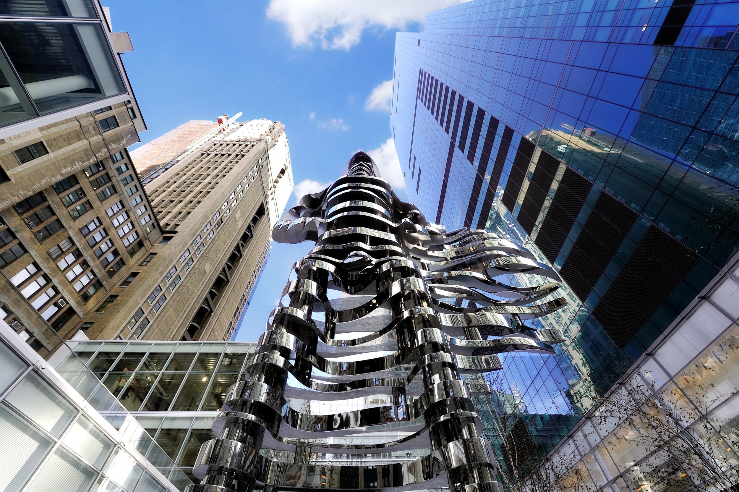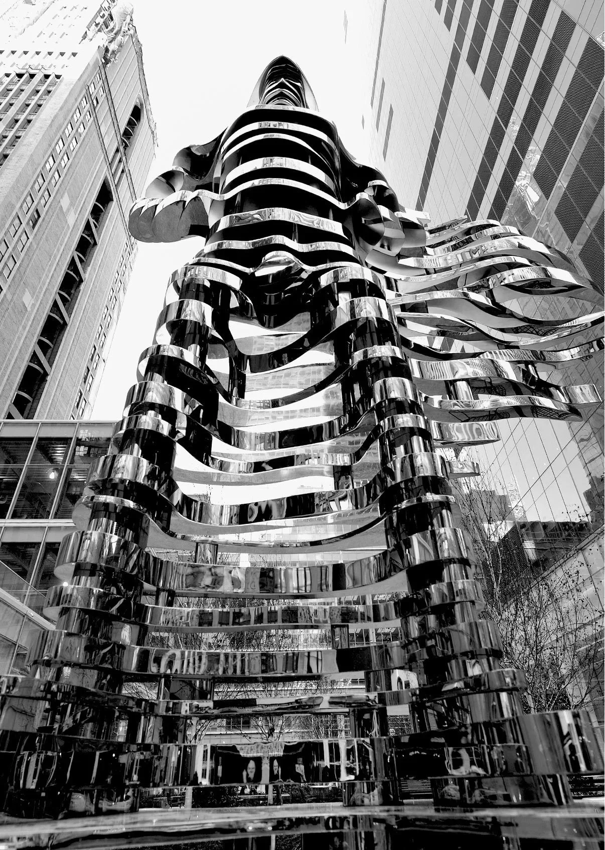 The Guardians: Hero and Superhero – Permanent public sculptures at Three Bryant Park, NYC, completed in 2013. Crafted in mirror-polished stainless steel, the 7-foot “Superhero” is part of an edition of eight (unique at this scale). Commissioned via a public art competition, the work embodies resiliency and innovation through a digitally generated architectural composition, offering a lasting statement in Midtown Manhattan’s urban landscape.