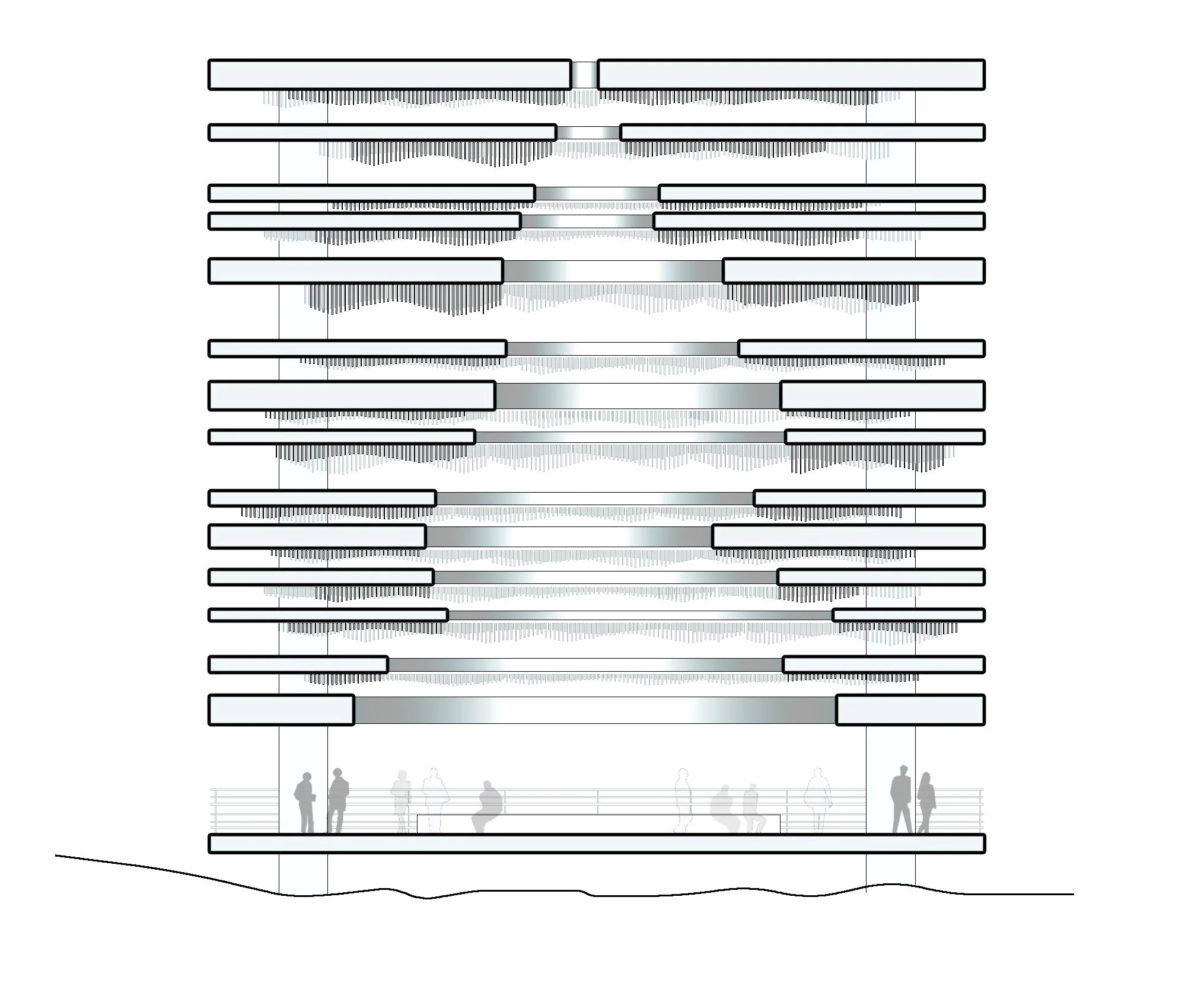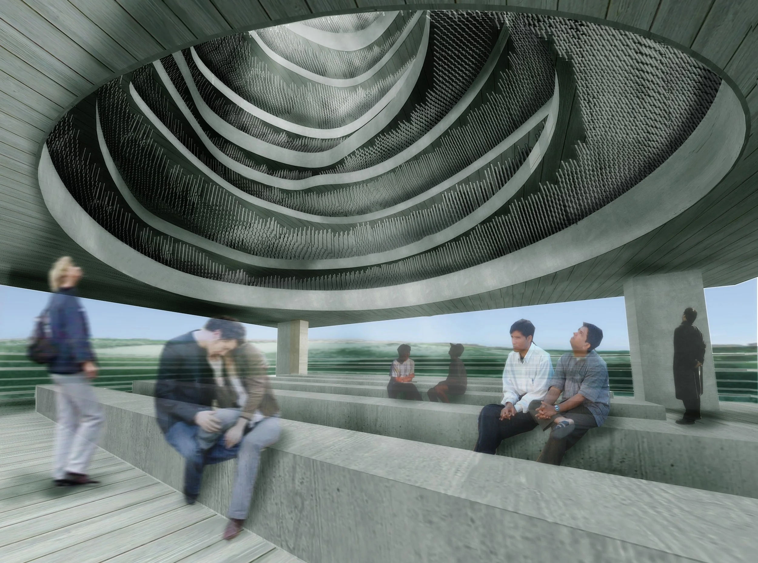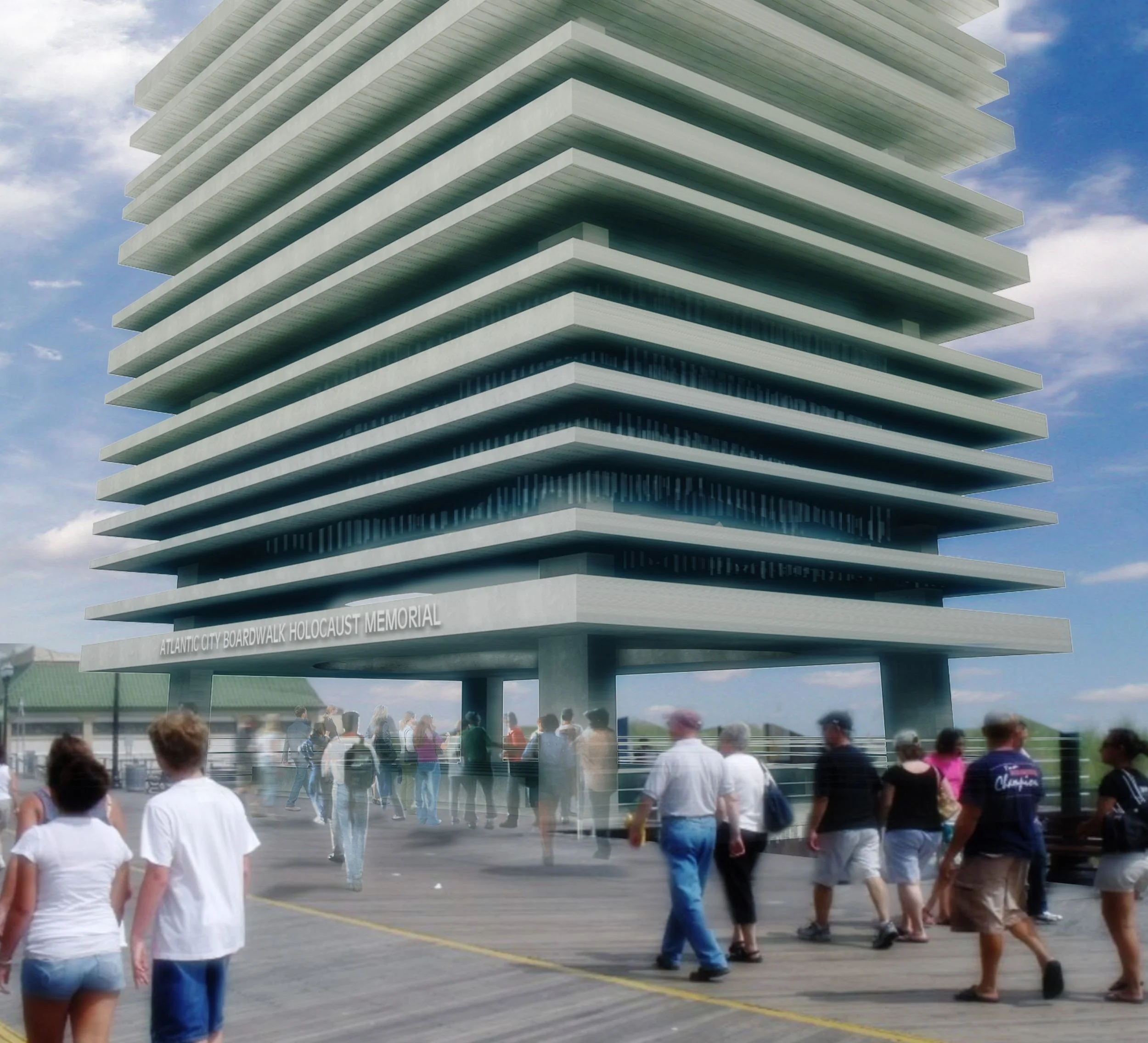 The Atlantic City Boardwalk Holocaust Memorial, designed by APS Designs, stands 58 feet tall as a powerful tribute to those lost. Its layered slabs form a contemplative domed space, while millions of stainless steel wind chimes evoke silenced voices, moving with the wind. Illuminated at night, the memorial blends light, shadow, and openness, creating a serene environment that honors memory, resilience, and reflection along the boardwalk.