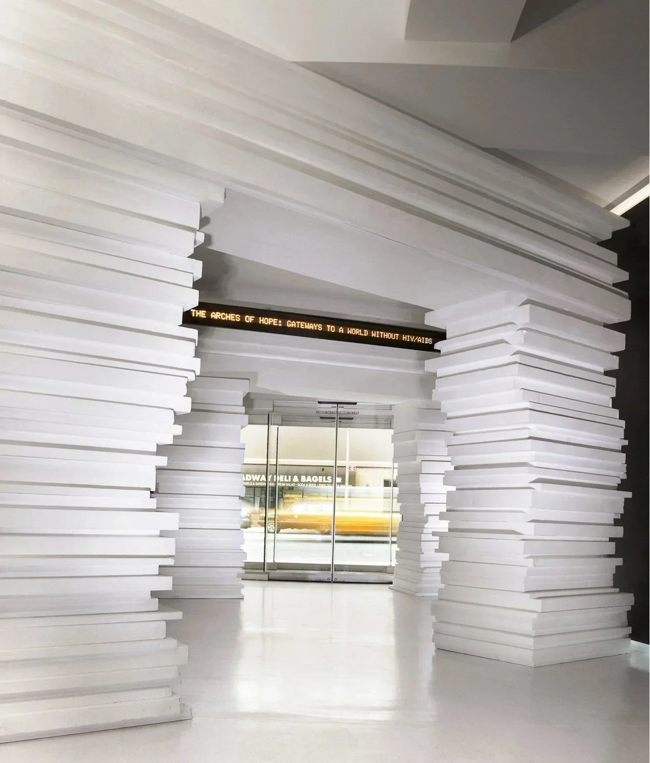 Arches of Hope – Times Square Installation – Temporary interactive public art by Antonio Pio Saracino, created in 2013 for Lifebeat and MTV’s Staying Alive Foundation. Comprised of three 10’ Styrofoam arches, the work represents three decades of HIV impact using 223 adoptable blocks. Broadcast live on Times Square jumbo screens at Out Hotel, NYC, the installation engaged the public to support HIV prevention programs for youth, blending awareness, participation, and artistic expression.