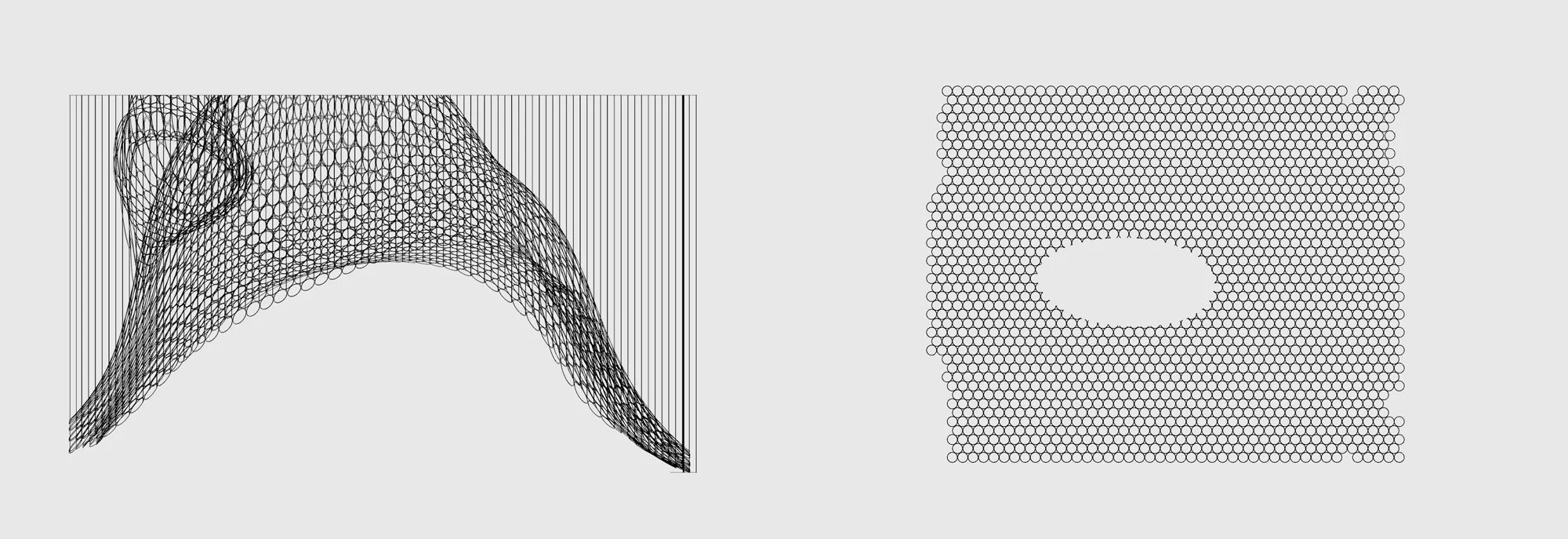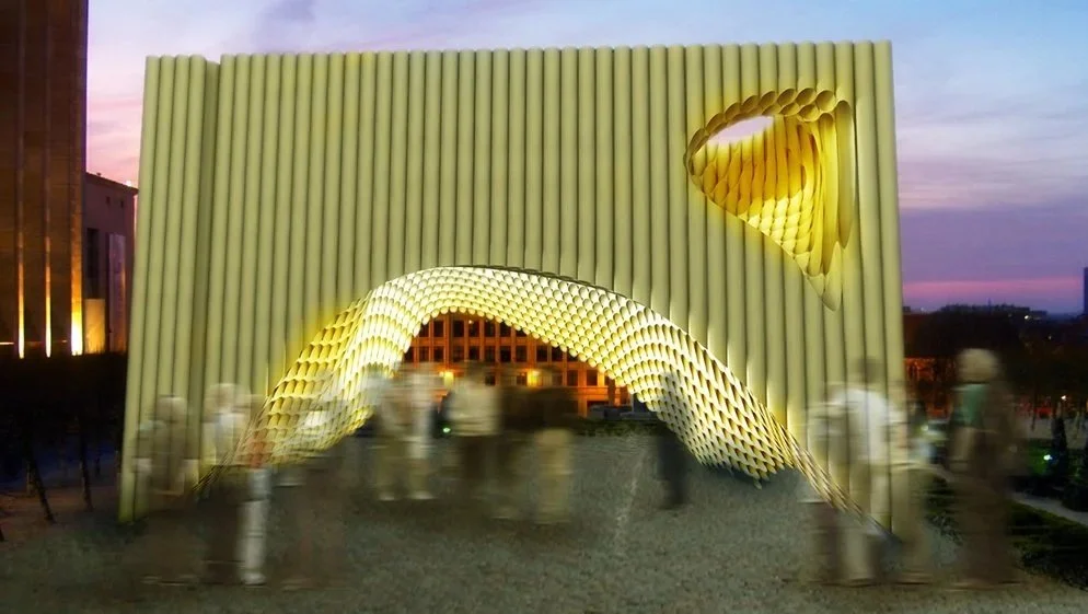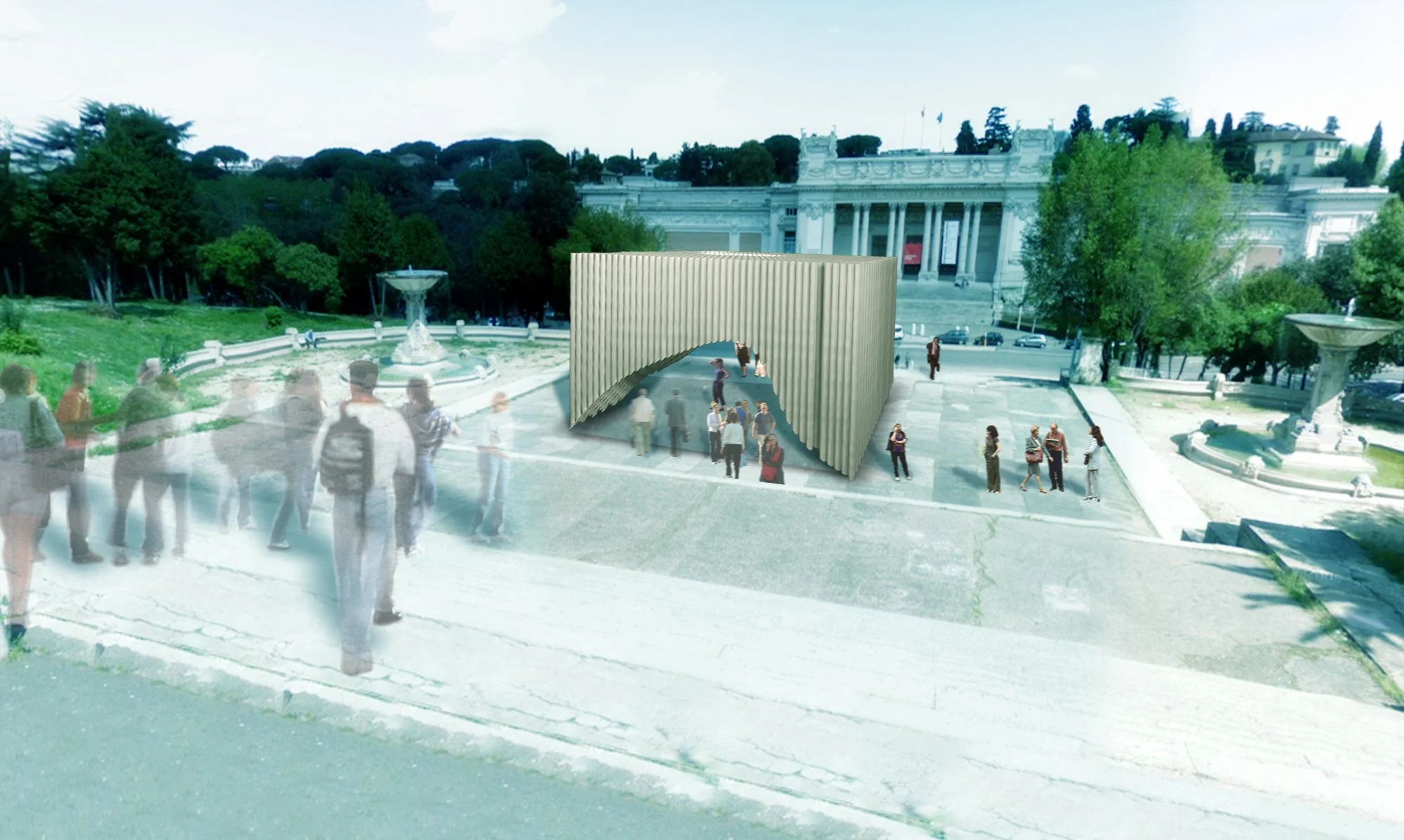 Arc of Triumph – Proposal for Rome – A conceptual public installation by Antonio Pio Saracino, designed for the National Art Gallery, Villa Borghese. Constructed from recycled paper tubes joined with metal screws and bars, the square-based structure features a hollow, curving interior “cave.” Varying tube heights create dynamic light effects, while a top oculus evokes the Pantheon, merging sustainability, modularity, and architectural symbolism in a unique, fluid form.