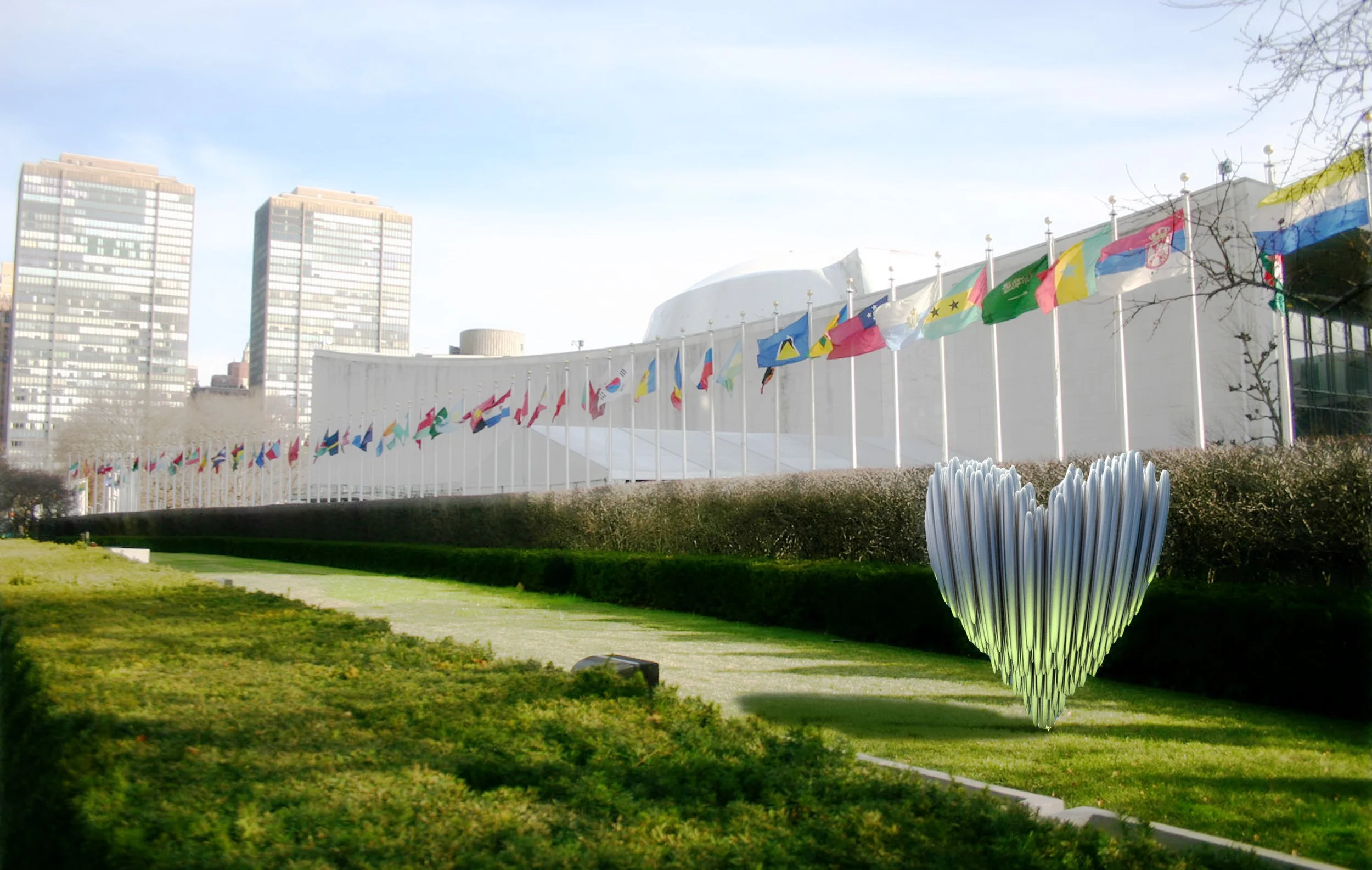 The United Heart – Concept Proposal – A mirror-polished stainless steel sculpture by Antonio Pio Saracino, measuring 10’×9’×4’. Composed of 193 interlinked components representing the UN member states, it symbolizes global unity, peace, and prosperity. The heart serves as a universal visual metaphor for life and harmony, reflecting the core mission of the United Nations to foster lasting peace worldwide.