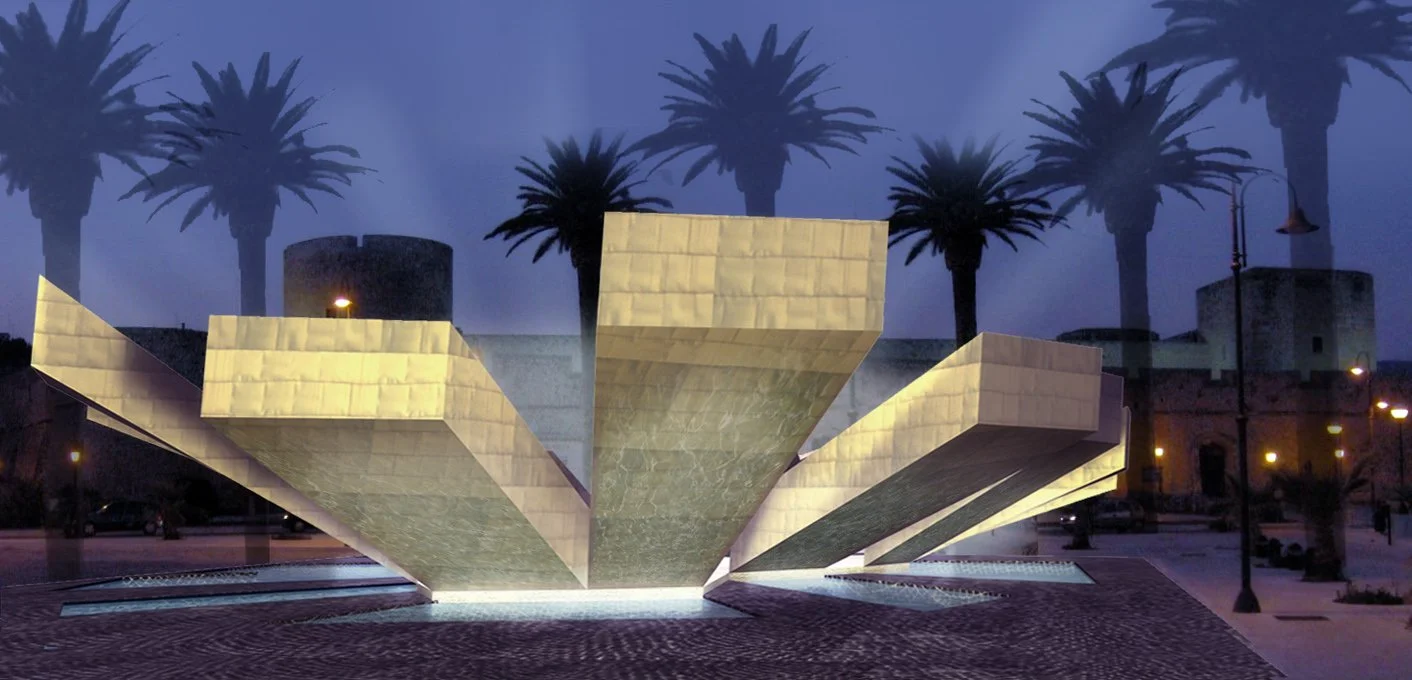 King Manfredi Square – Proposal – Commissioned in 2010 and recipient of the King Manfredi Award for Architectural Excellence, Antonio Pio Saracino designed this public plaza in Manfredonia, Puglia, Italy. Inspired by the eagle of the Manfredi family crest, the square features elevated ramps forming an open-air theater, wing-like stairways with reflective pools beneath, and a central stage overlooking the 13th-century castle. Titanium-clad ramps and local marble paving complete the design.