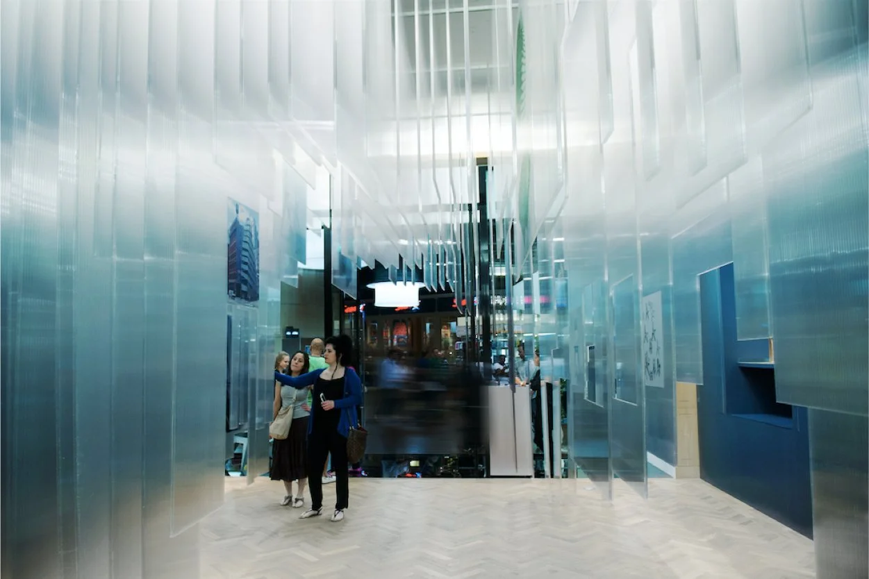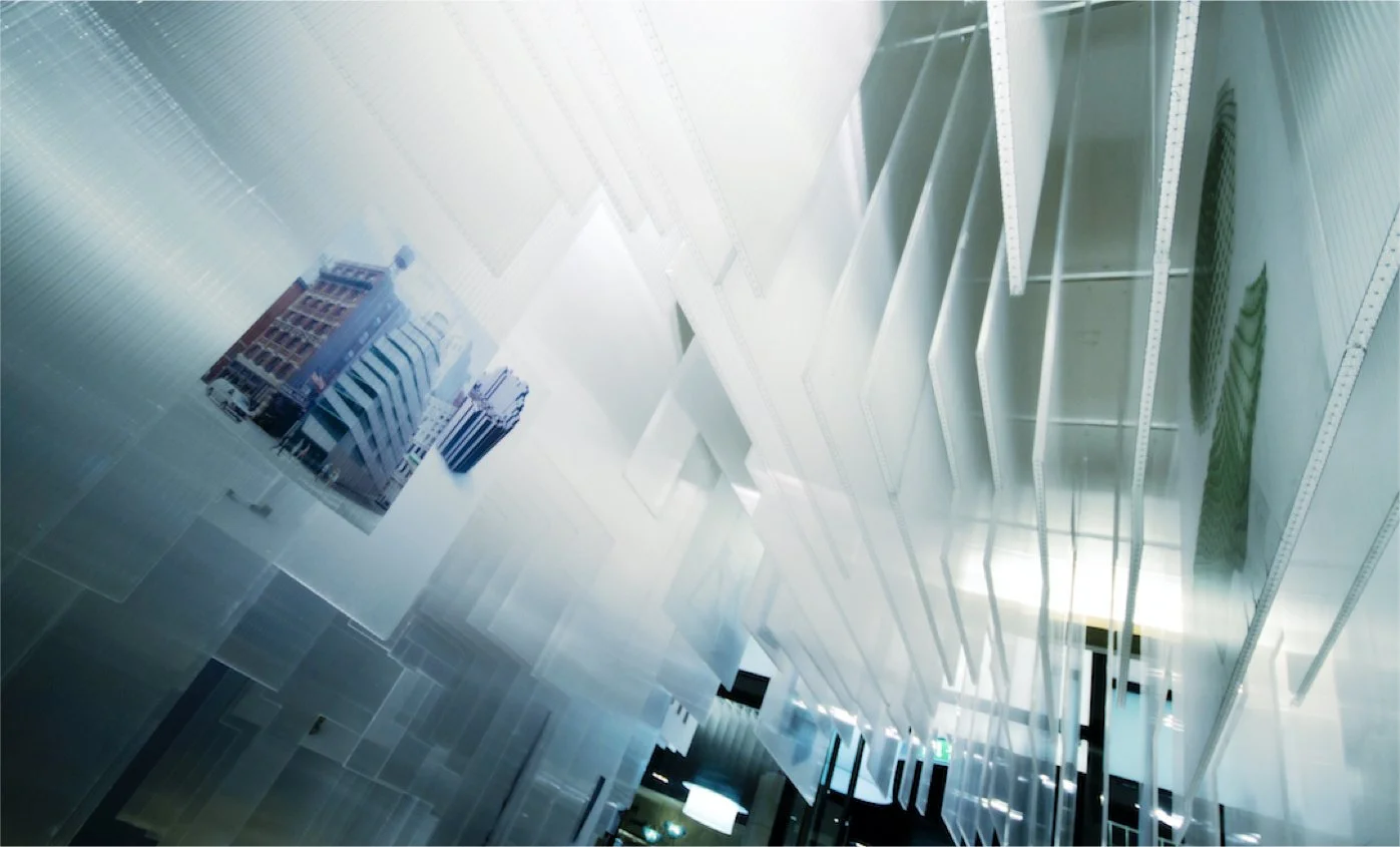 City Within – Dubai Mall, Design Days Dubai (2012) – Antonio Pio Saracino’s temporary installation, commissioned by Design Days Dubai and Bloomingdales, uses translucent polycarbonate sheets and steel to form a 40’ × 20’ × 10’ sculptural box. Carved into a multi-dimensional cityscape, it contrasts the ephemeral with the physical city, offering visitors a contemplative space to engage with the metaphor of the contemporary digital city.
