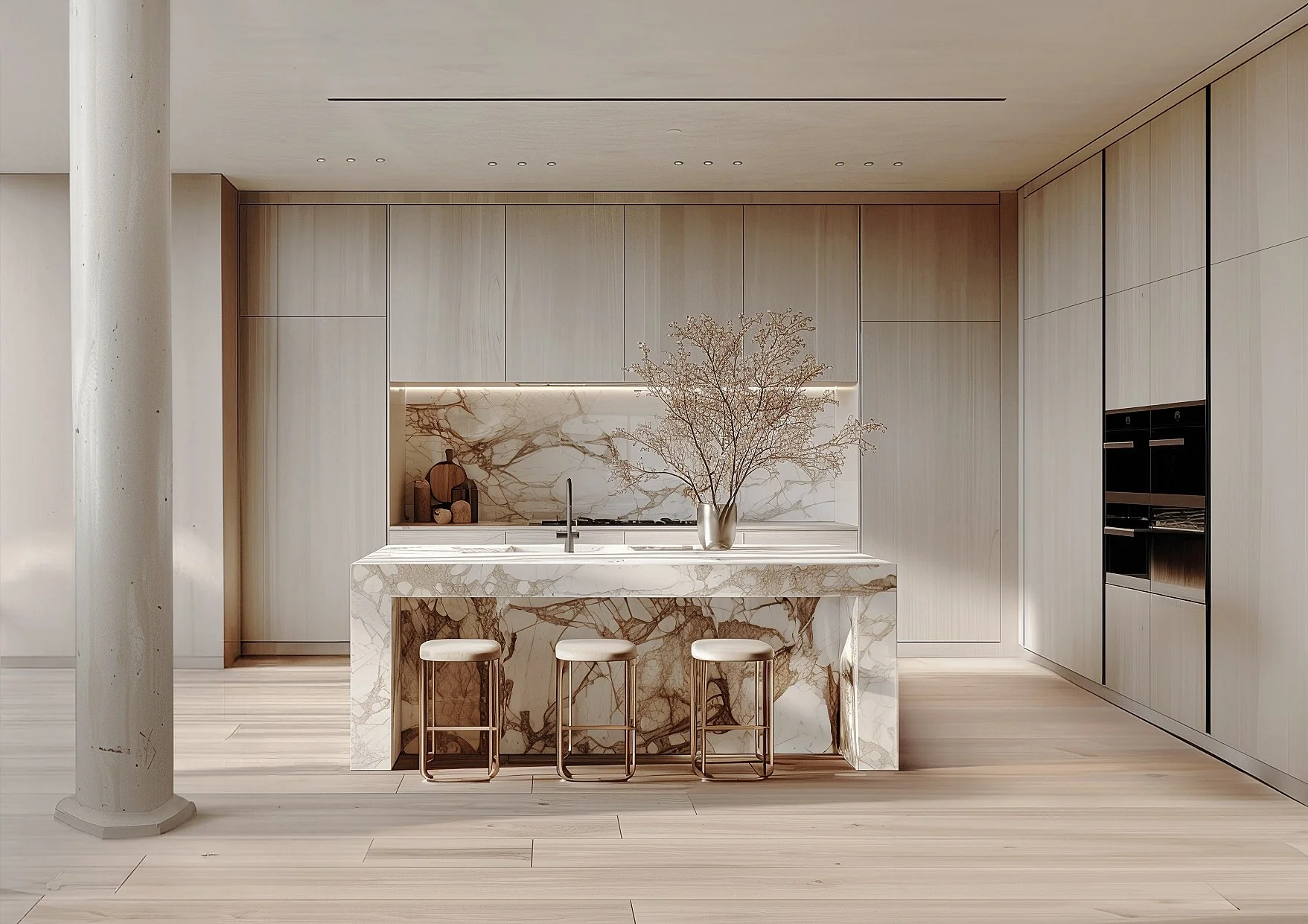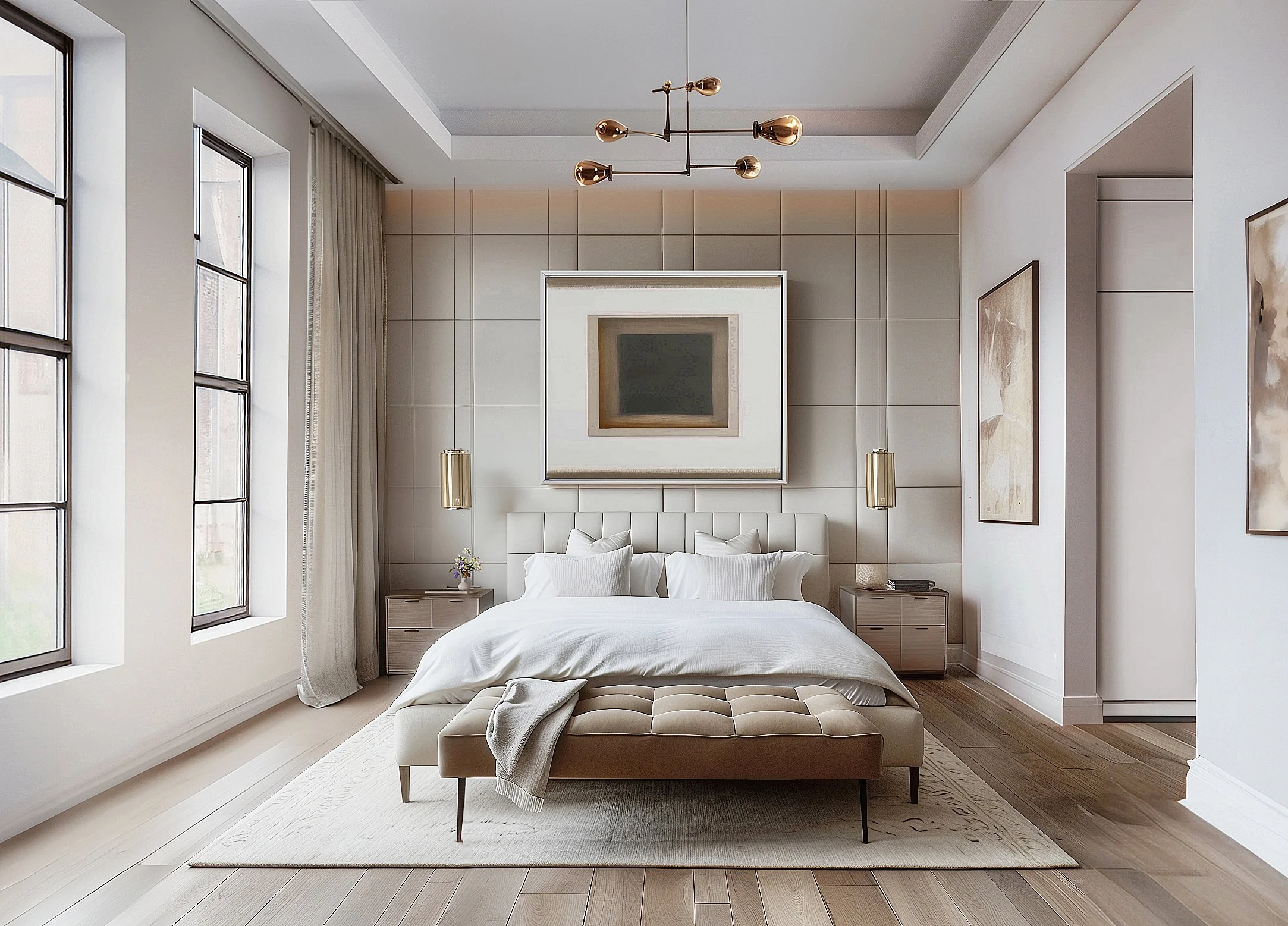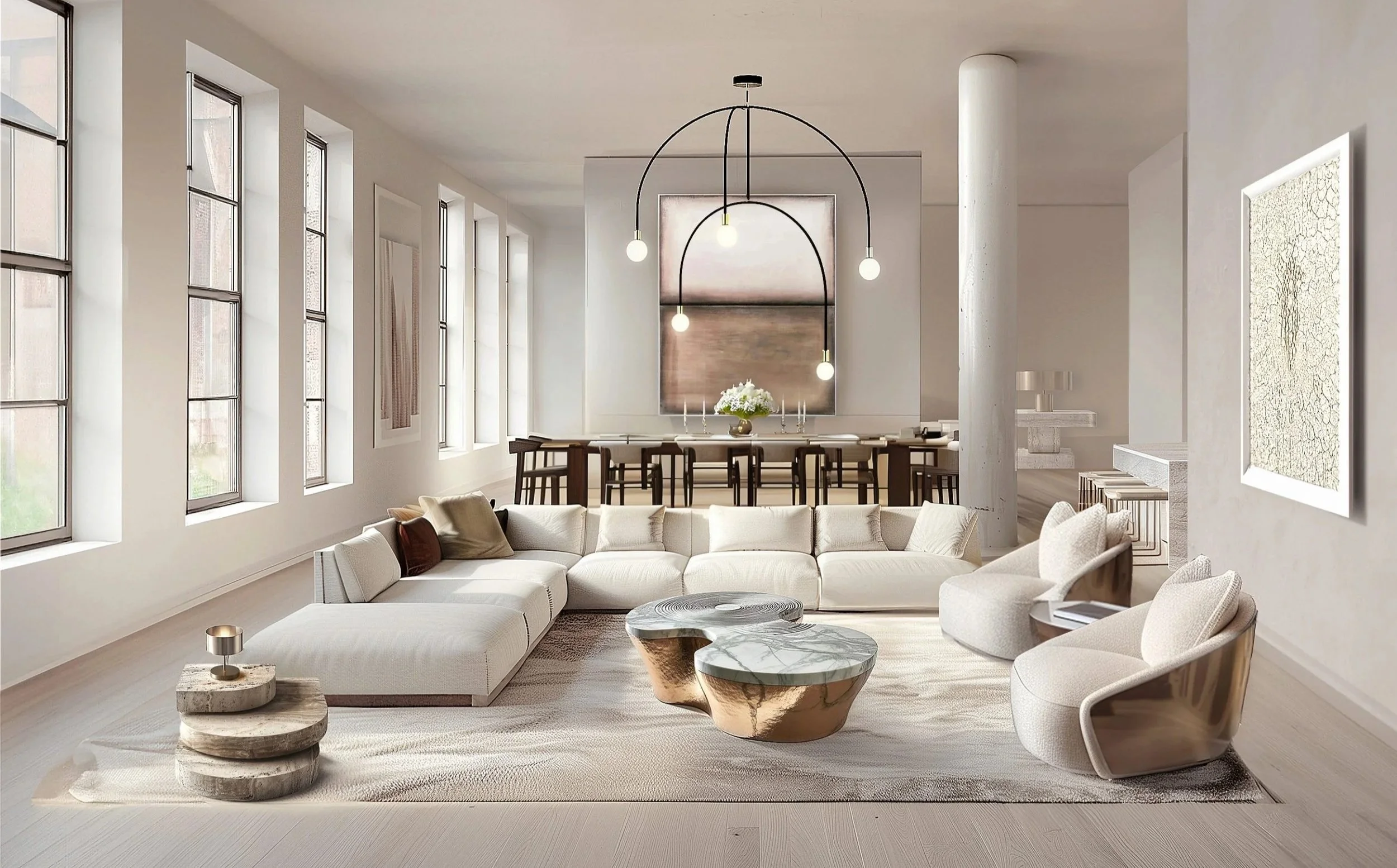 Designed by APS Designs under Antonio Pio Saracino, this 2,000-square-foot Soho loft blends contemporary minimalism with historic character. Configured with two bedrooms and adaptable to three, it features open living spaces filled with natural light, white ash cabinetry, and Calacatta Gold marble. Neutral tones, refined materials, and sculptural details create an elegant, flexible urban retreat rooted in modern sophistication.