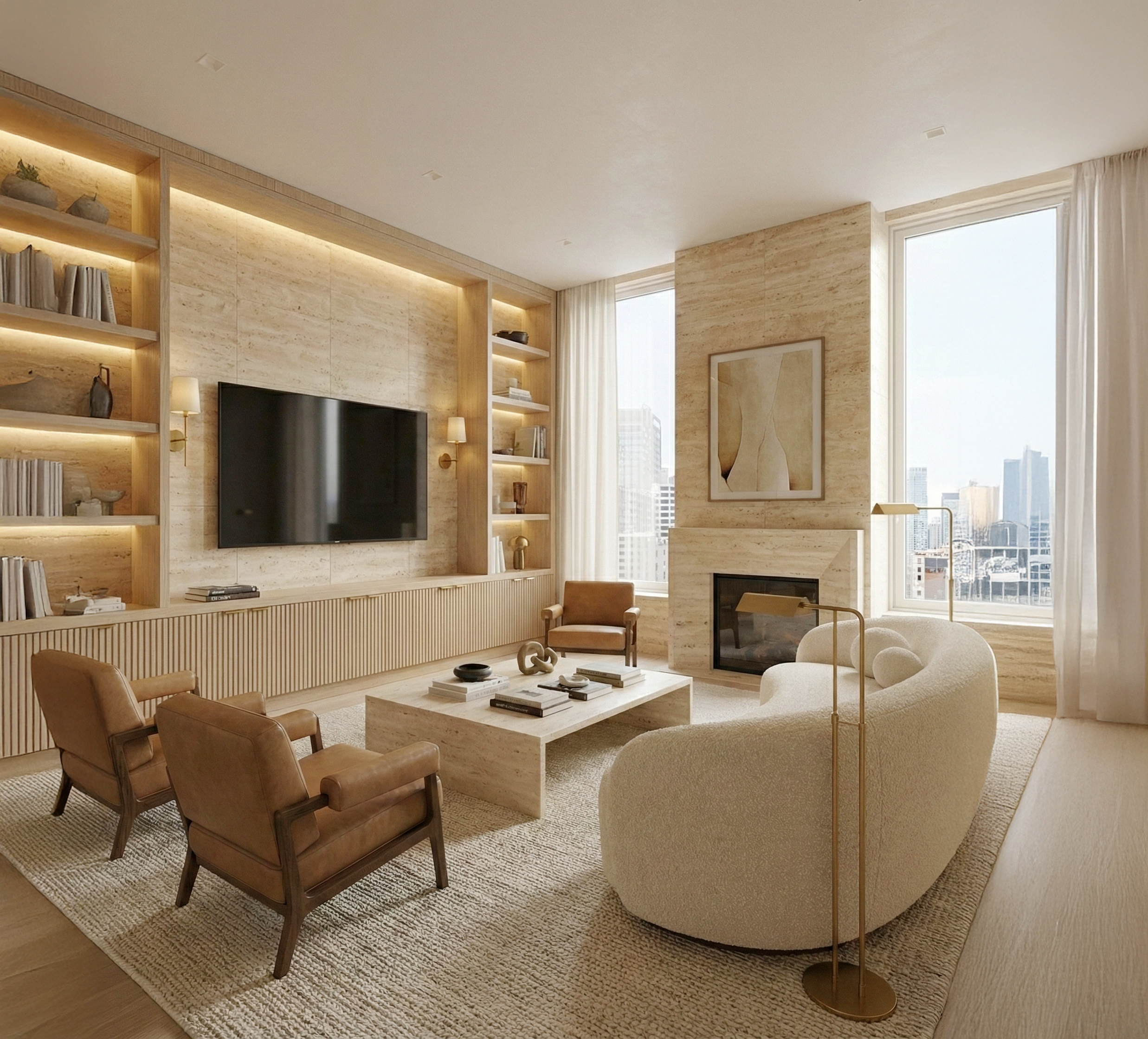 A 5,500 sq ft, six-bedroom Midtown Manhattan duplex reimagined for contemporary living. At the center of the home, APS Designs conceived a sculptural staircase with curved wood paneling and bronze accents, set within a restrained palette of white ash, travertine, and black marble. More than a circulation element, the stair becomes the vertical heart of the residence, anchoring a refined sequence of rooms where crafted detail, balanced proportion, and modern comfort create a timeless and elevated atmosphere.